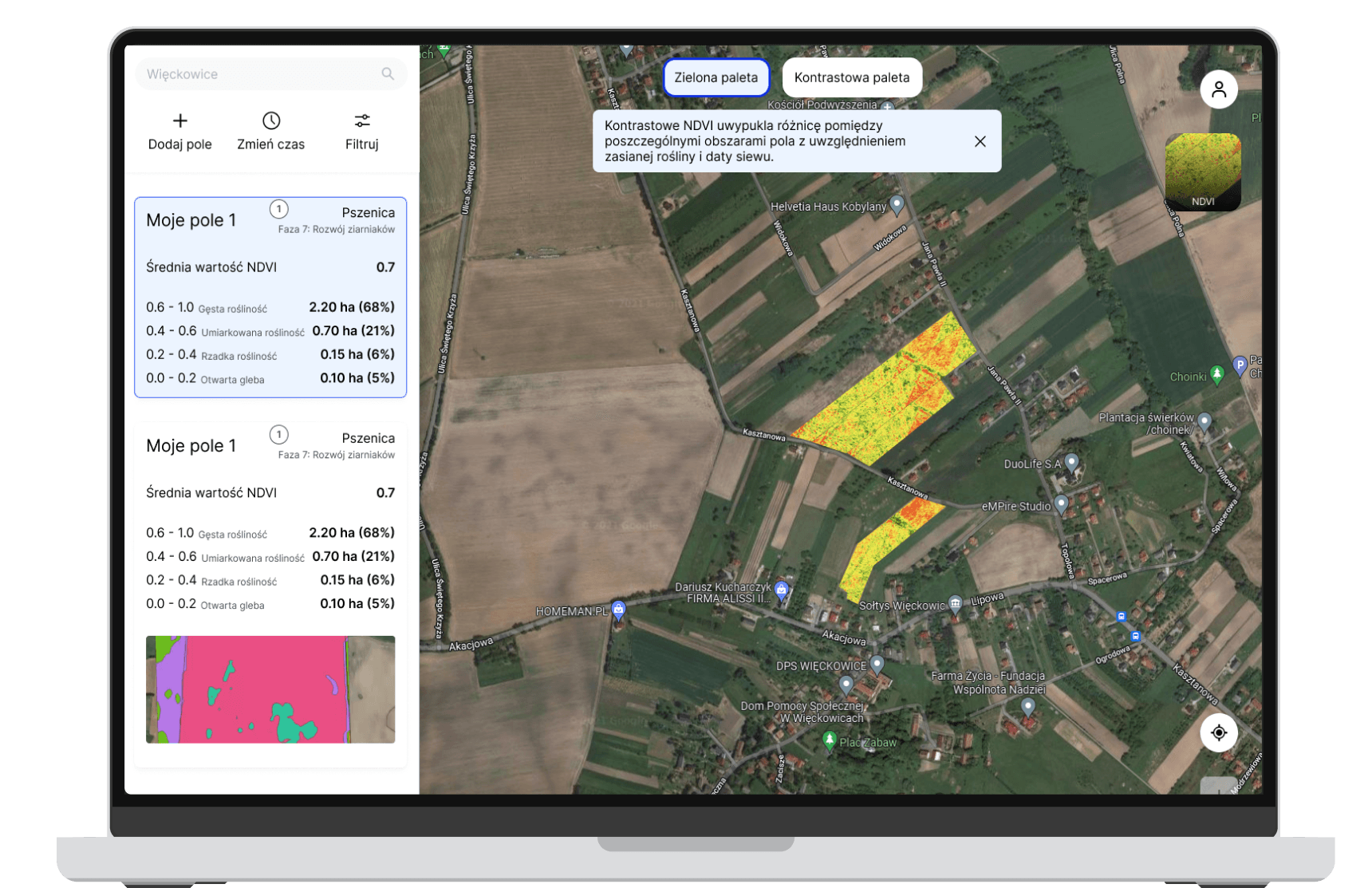 - Oszczędność czasu i pieniędzy: NDVI pozwala na bieżące monitorowanie stanu roślinności bez konieczności przemieszczania się po polu. Dzięki temu rolnicy mogą oszczędzić czas i pieniądze, które mogliby przeznaczyć na inne działania.